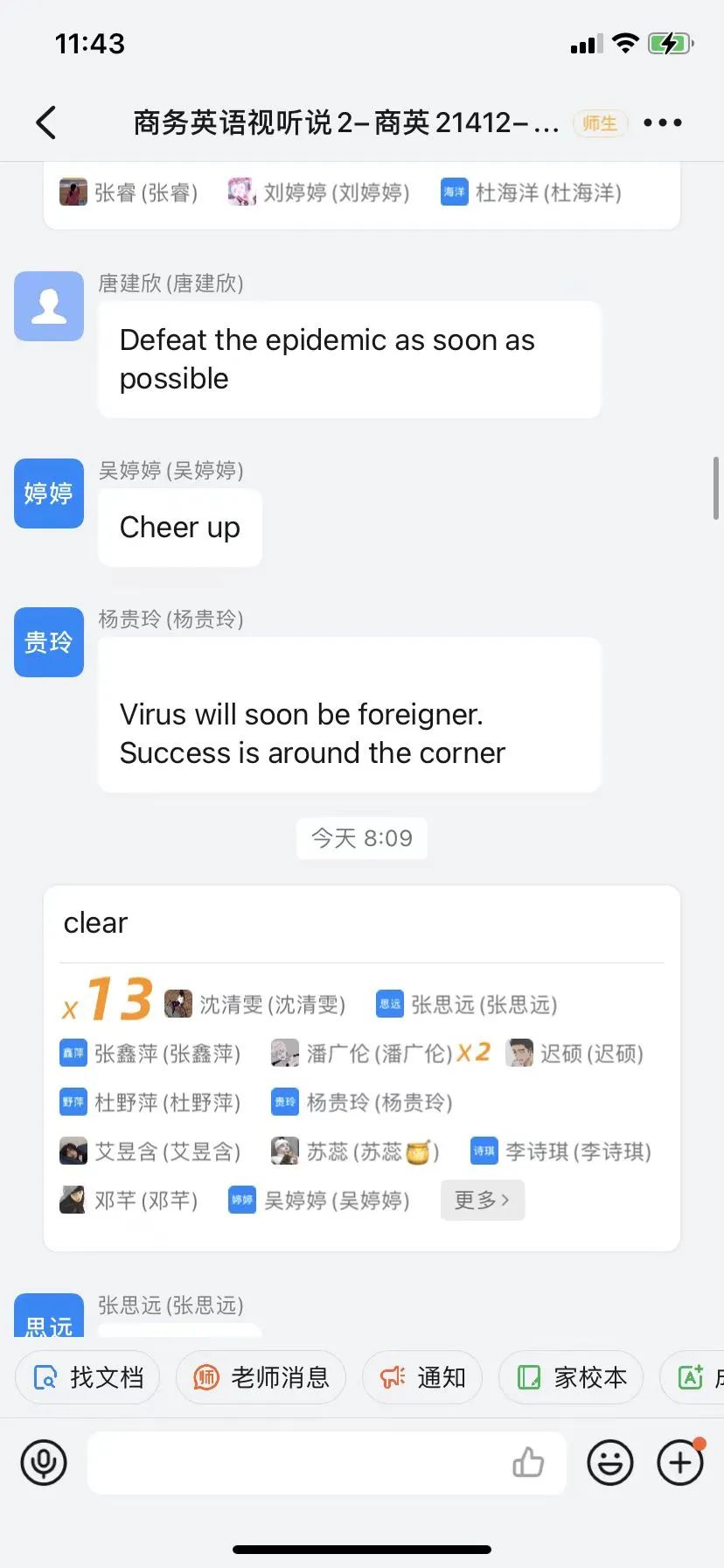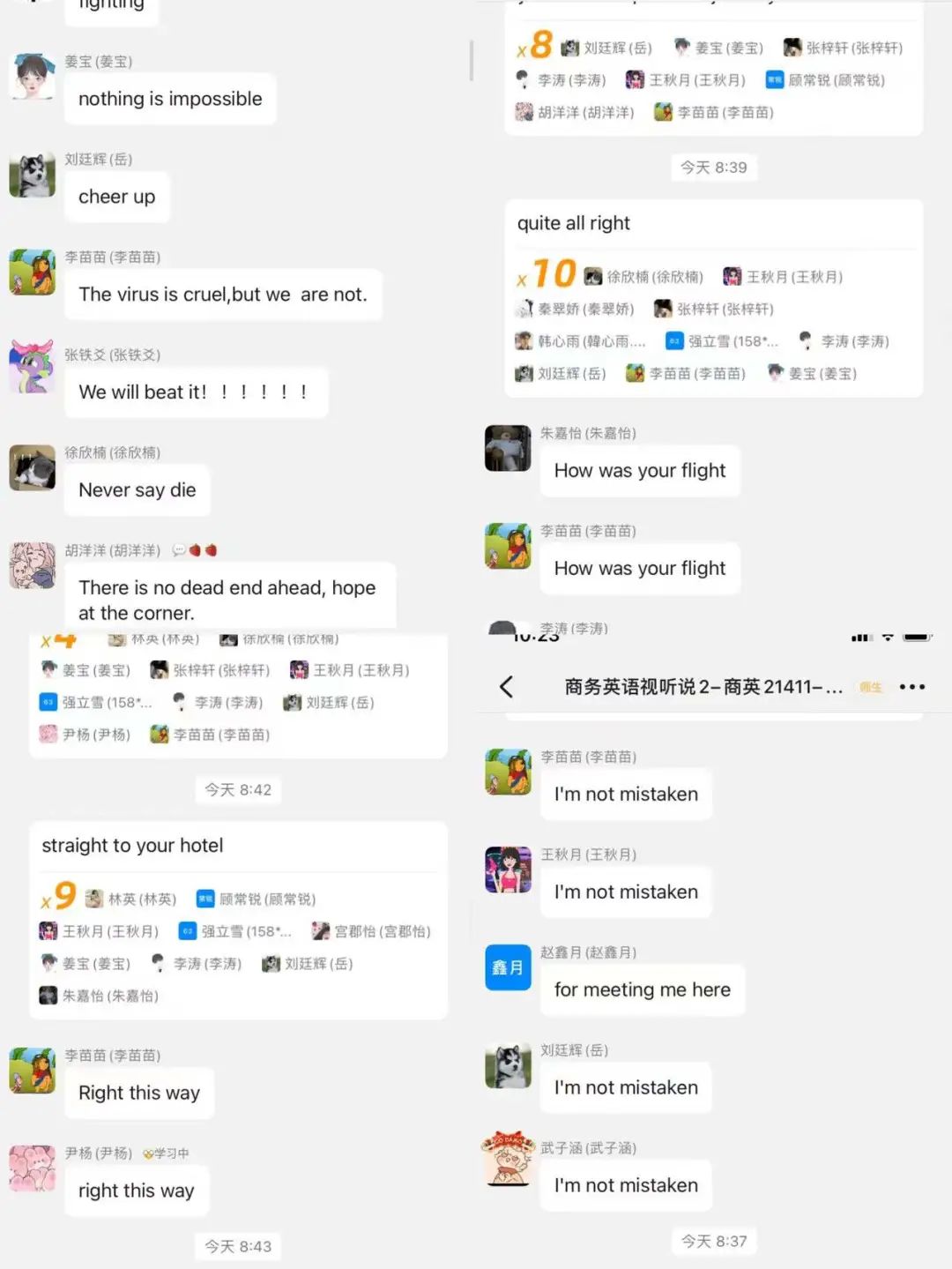在课堂开始之前,老师先与员工们进行了交流,了解了大家的封校生活,安抚了隔离员工的情绪,希望同学们面对疫情可以做到不信谣、不传谣、科学防控、从容应对,积极传播网络正能量,同时引导大家利用好这段时间,在保证学习进度的基础上,适当进行放松娱乐,保持身心愉快。同时,将3377体育手机平台抗击疫情过程中的故事作为主要课程思政内容,引导员工关心时事,激发员工形成内在的、持久的学习驱动力,并组织员工观看相关抗疫小视频,将抗疫精神融入到英语课堂当中,组织员工一起用英文为抗疫加油。