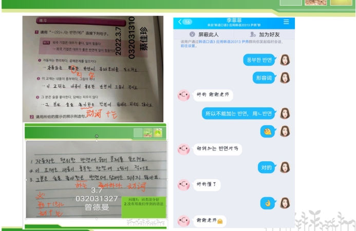 韩语口语课的线上教学工作主要通过腾讯会议和QQ群进行,用腾讯会进行授课直播,用QQ群发放学习资料和学习任务,并进行辅导答疑和师生互动。
