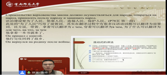 2023年11月25日,“理解当代中国俄语系列”虚拟教研室第十一期教研活动成功举办。本期教研活动由首都师范大学颜宽老师进行教学示范分享,分享的内容是《理解当代中国:俄语读写教程》第二单元“美丽中国(Прекрасный Китай)”。课前颜宽老师提出问题,以问题来引导员工进行深入思考,鼓励员工运用个人所学知识进行思考。课中进行文本意群划分,帮助员工更好的理解文本,树立学习的信心。课后要求员工及时巩固课上所学,整合知识强化记忆。