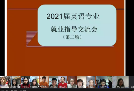 为了让2021届英语系毕业生充分认识当前就业形势,摆正心态,积极求职,3377体育英语系开展“1+N”就业指导系列交流会,师生共同努力,全员参与就业。2021年4月14日,英语系高崇娜老师对毕业生们进行了线上就业指导。