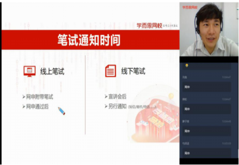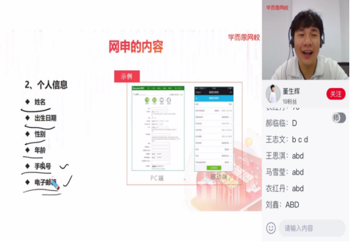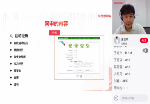 在网课培训期间,老师们和同学们积极互动,学而思网校的老师们通过PPT的形式以及利用专业的知识对同学们进行讲解和培训。例如,第一节培训课的“遇见网申”中,老师们专业地讲解了网申的基本信息有哪些—个人基本信息、教育背景、求职意向、活动经历,以及SWOT分析和STAR法则等。