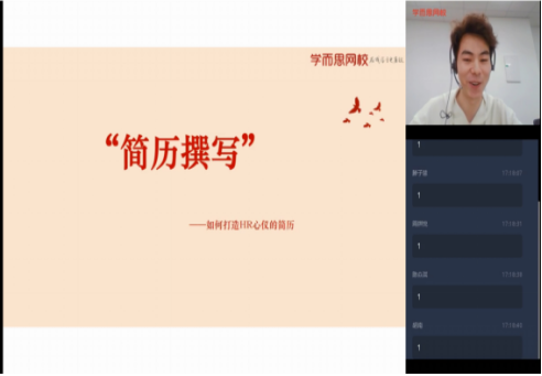 第二节培训课程由赵东阳老师为同学们进行线上培训“简历撰写”,其中包括了简历常识、如何撰写简历、简历中常见的问题、打造个人品牌。