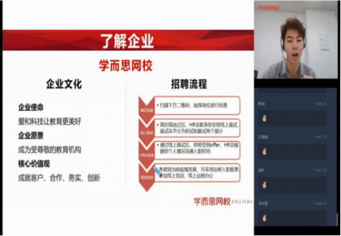 通过将近一周的培训,同学们收获满满如何网申、如何撰写一份漂亮的简历、如何顺利通过笔试、如何通过面试环节中的无领导小组讨论以及结构化面试等一系列问题,同时也让选择学而思网校实习的同学们对如何顺利通过面试考核进一步的了解,让我们共同期待接下来的培训课程吧!
