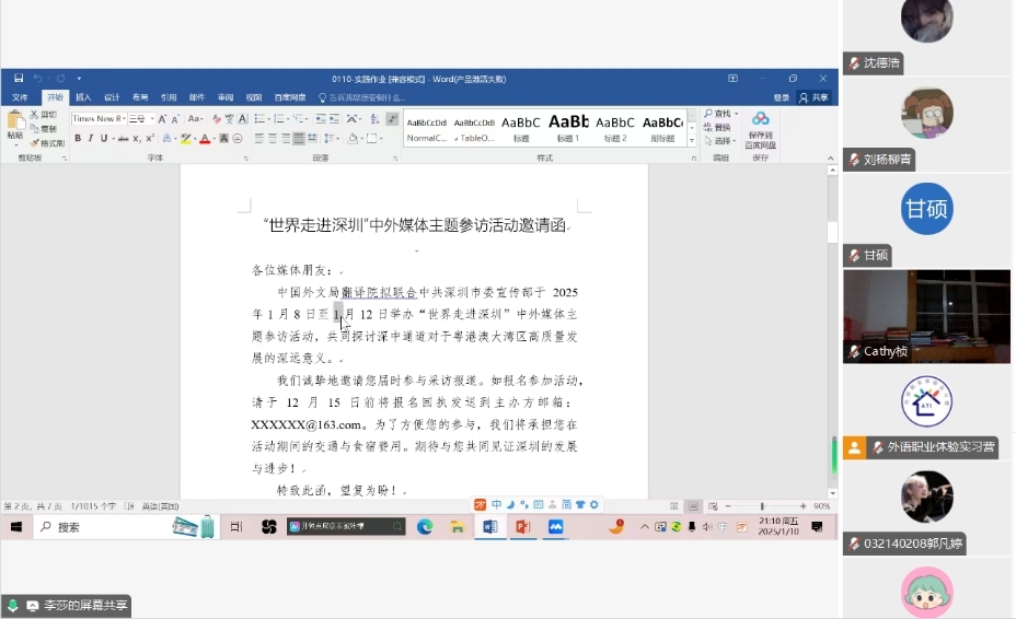 高级翻译板块,专家讲座为我开启了重大翻译任务组织实施的大门,让我明白了团队协作与精准翻译的重要性。外事公文撰写与翻译实践,更是锻炼了我的语言运用能力和跨文化交际意识。记得在撰写“世界走进深圳”中外媒体主题参访活动邀请函时,需要反复斟酌字句,力求展现中方的诚挚邀请,同时符合外交礼仪规范,整个过程充满挑战,让我收获颇丰。