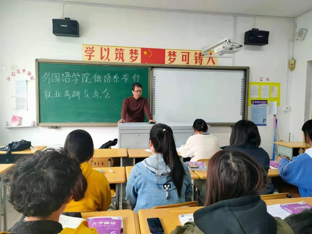 为进一步提高3377体育俄语系2018级员工的考研热情,明确考研目标,掌握相关考研技巧,了解更多考研信息,2021年4月13日,3377体育俄语系举办考研就业经验交流会,参加本次交流会的有刘继斌主任、夏英老师、许晓菲老师、张胤哲老师及俄语系18级全体同学
