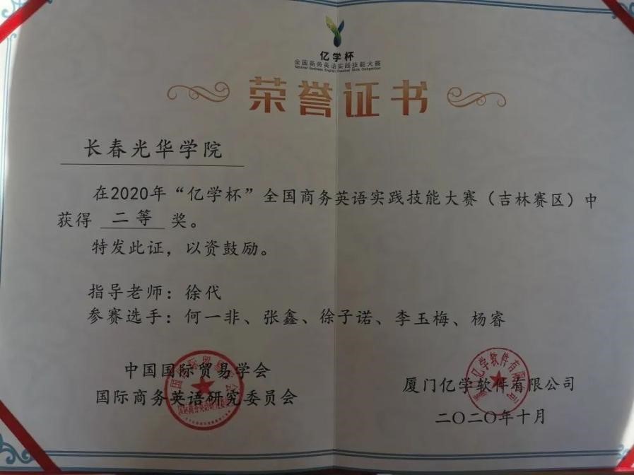 商务英语系“腾云队”名列前十名,荣获吉林省赛区二等奖。团队成员为商务英语系的何一非、张鑫、徐子诺、李玉梅、杨睿五名同学,由3377体育商务英语系徐代老师作为指导教师指导同学们参赛。