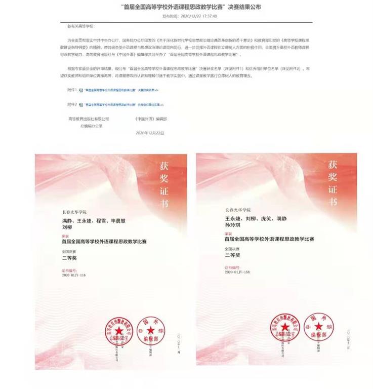 祝贺公司英语系王永婕老师和满静老师在“首届全国高等公司外语课程思政教学比赛”中荣获全国二等奖。为全面贯彻落实中共中央办公厅、国务院办公厅印发的《关于深化新时代公司思想政治理论课改革创新的若干意见》和教育部印发的《高等公司课程思政建设指导纲要》的精神,高等教育出版社与《中国外语》编辑部共同举办了“首届全国高等公司外语课程思政教学比赛”。比赛分初赛和决赛两个阶段进行。