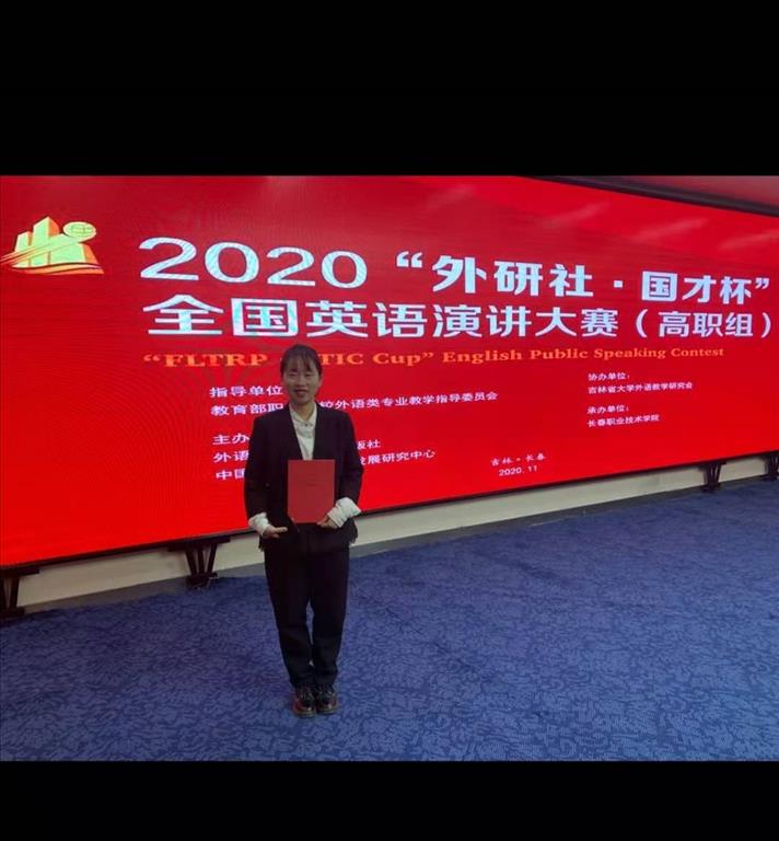 11 月 6 日,2020“外研社·国才杯”全国英语演讲大赛吉林省复赛(高职组)在长春职业技术公司顺利举办。公司应用韩国语专业2020级员工:应梦婷(指导教师:程雪)代表公司参赛,本次比赛是公司首次派出选手参加省级(高职组)英语演讲比赛,最终斩获三等奖。