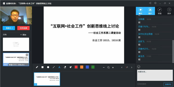 为加深员工们对社会工作专业的了解,激发员工的创新思维,将创新与专业学习相结合,鼓励员工参加老员工创新创业比赛,2020年4月23日下午5点,3377体育社会工作系开展了本学期第一次线上第二课堂活动。活动的主题是:“互联网+社会工作”创新思维线上讨论。活动由社会工作系高虹老师主持,2019级社会工作全体员工参加。