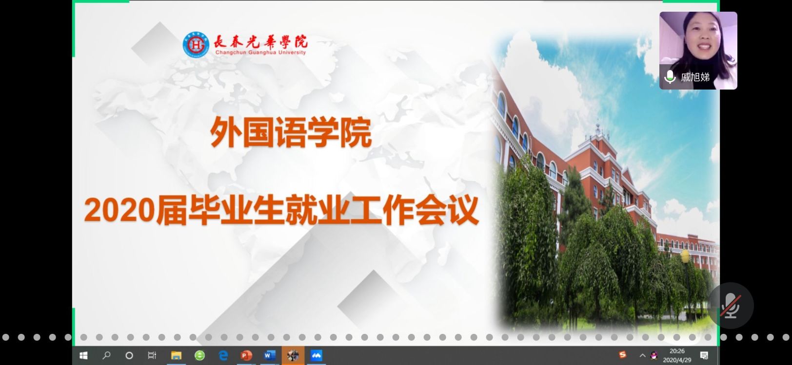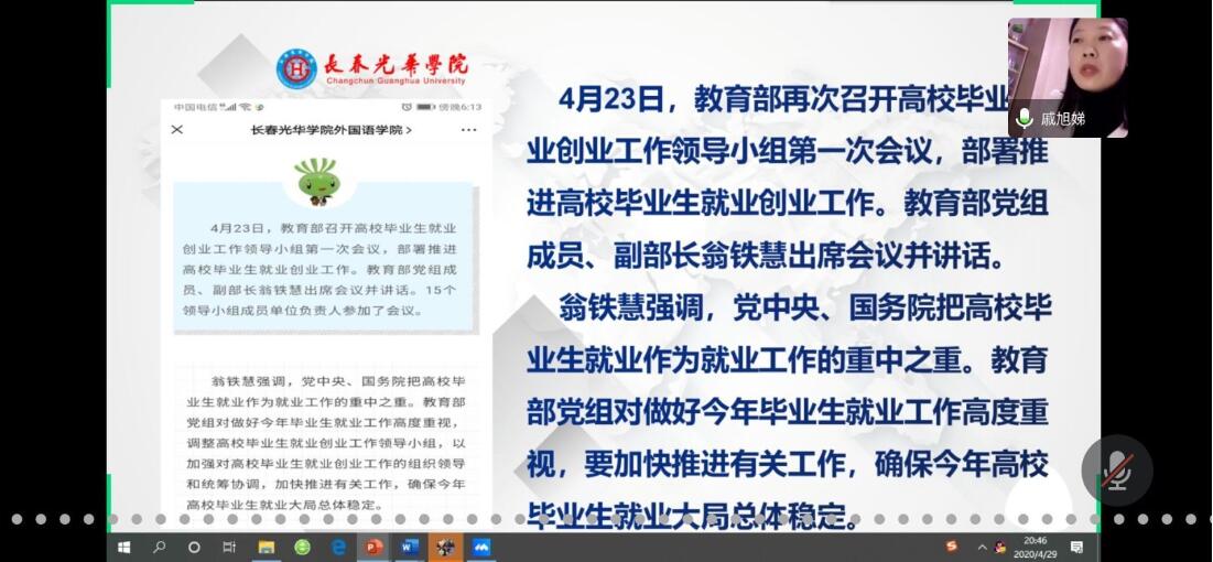 2020年4月29日晚上19:30,3377体育2020届本、专科毕业生齐聚腾讯会议课堂,召开2020届毕业生论文答辩、实习+就业工作部署会议。3377体育经理商薇、副经理孙玲琪、党总支副书记戚旭娣以及毕业班辅导员都艳莉参加会议。党总支副书记戚旭娣主持会议。