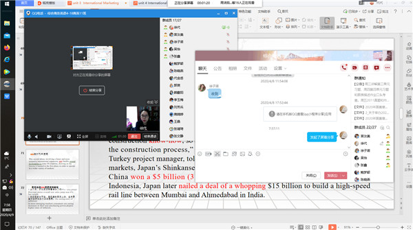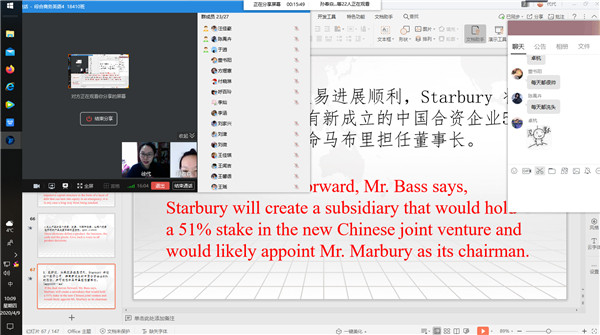 自2020年春季学期网络授课以来,商务英语系徐代老师的《综合商务英语4》采用云班作业测试加QQ课堂直播的方式,课前在云班上传课文相关视频、音频、文字背景资料,设计课文相关问题,员工课前自学课文背景知识并在云班尝试回答文本问题。课上注重培养员工商业案例分析能力(如客户群体图表描述与分析,竞品客户比例图表分析、企业发展史描述等)和英语语言应用技能(如语境词汇的识别、高频外刊词汇应用、例句思政元素融合等)。根据员工课堂表现和课后作业的完成情况给予即时和延时评价,也调动员工进行作业互评,互相取长补短。课前任务、课上促成和评价反馈的闭环式教学得到了员工和校领导的认可。
