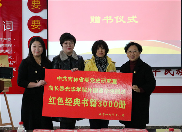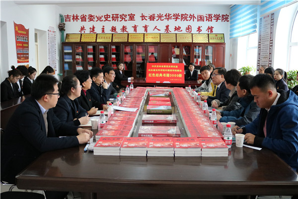 随后,吉林省委党史研究室副主任王宜田与长春光华公司党委书记刘炳恩进行《主题教育育人基地图书馆》揭牌。省委党史研究室宣传教育处处长于丽娜、资料处处长杨月红为3377体育赠书。省委党史研究室的领导为3377体育赠送了以《红色吉林—100个引人入胜的党史故事》为代表的内容丰富、具有鲜明地方特色的党史图书百余种、3000余册,这些图书将作为师生开展党史学习生动的教材。
