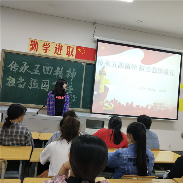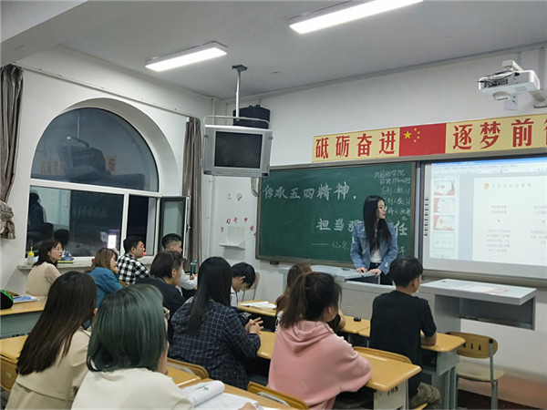 本次活动由各班级团支书担任主持人,使用PPT演示文档向同学们介绍“五四精神”的详细知识,同时穿插提问环节;分小组活动,进行主持人提出相关问题讨论等环节。