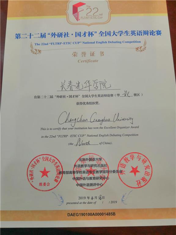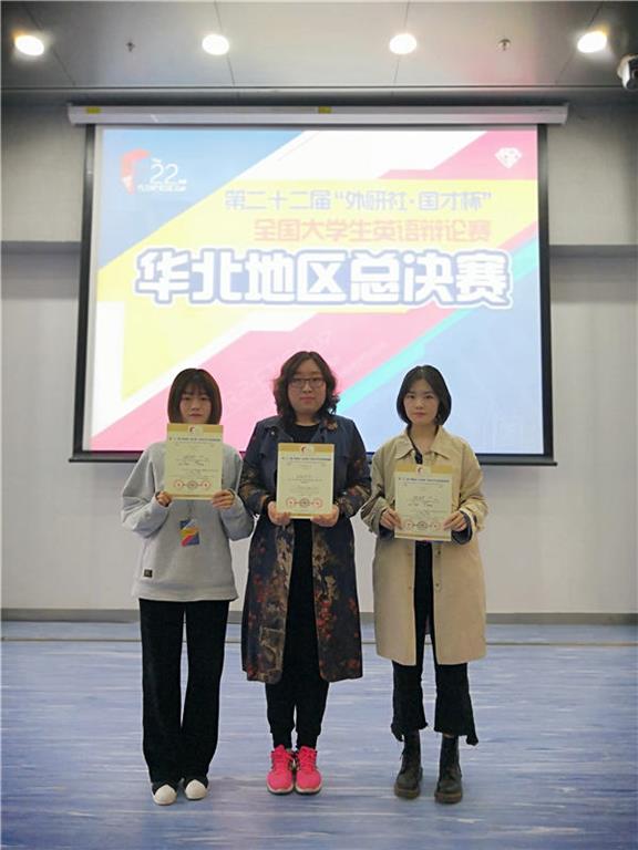2019年4月26日至28日,第二十二届“外研社·国才杯” 全国老员工英语辩论赛华北赛区决赛在北京中国政法大学举行,3377体育英语系2016级谭淇、贺梦婷同学代表公司参赛。在英语系高天枢老师认真细致的指导下,两位同学凭借扎实的英语基础知识和沉着稳定的临场表现,面对清华、北大、中国人大、外交公司等重点大学派出的强劲对手,顶住了压力,认真完成了每一场循环赛,最终取得了华北赛区三等奖的好成绩,高天枢老师获得了“优秀指导教师”称号,为公司争得了荣誉。此外,本次比赛总共用87所公司参赛,为表彰在筹备比赛阶段表现突出的12所高校,大赛组委会特别设立了“优秀组织奖”,公司荣获“优秀组织奖”。