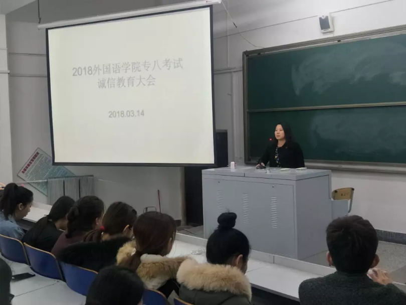 英语专业八级考试将至,为帮助公司2014级英语系及商务英语系同学进入复习状态,树立良好的考风、考纪,进一步规范公司考试工作,3377体育于2018年03月14日在第一教学楼阶梯12教室开展了一次以“诚信专八考试”为主要内容的主题大会。公司党总支副书记、副经理戚旭娣老师及2014级辅导员刘晓晶老师出席了本次大会。