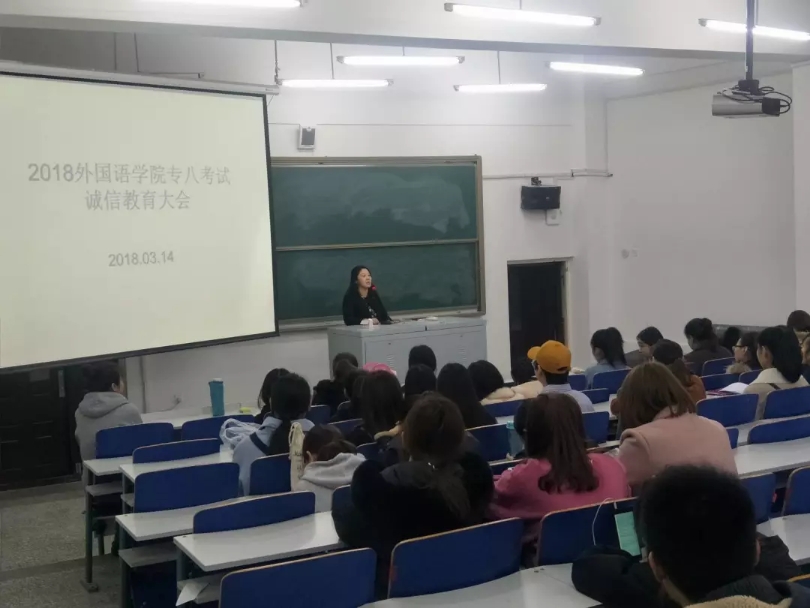 首先辅导员刘晓晶老师在会上向同学们讲解了关于考试作弊的危害以及惩处条例,并详细的解读了专业八级考试要求、证件要求,禁止带手机进考场等具体的考试纪律。