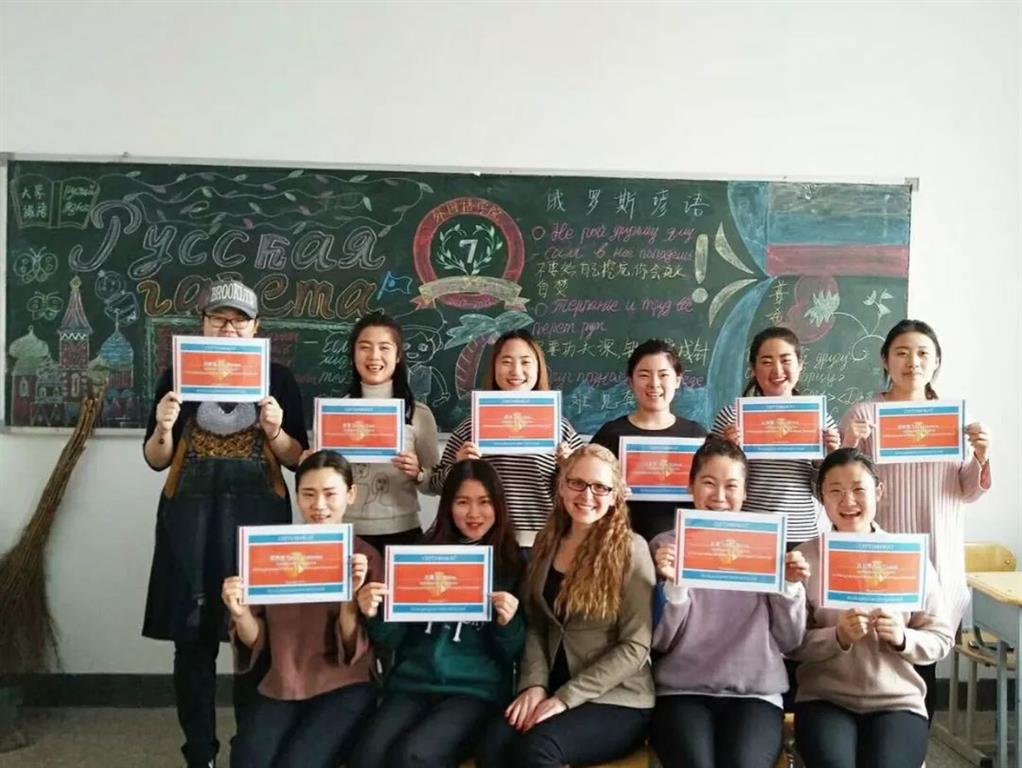 为提高俄语系同学对俄罗斯国情的了解与认知,2017年12月9日上午十点,在俄罗斯外教达丽雅·安德烈耶夫娜老师的主持下,俄语系的员工楼前燕、章静航、薛冰、赵容毅、金雪、赵敏、杜敏、王丝雨、刘梦迪、郑玉秀参加了由俄罗斯国家杜马青年委员会组织的俄罗斯历史知识竞赛。
