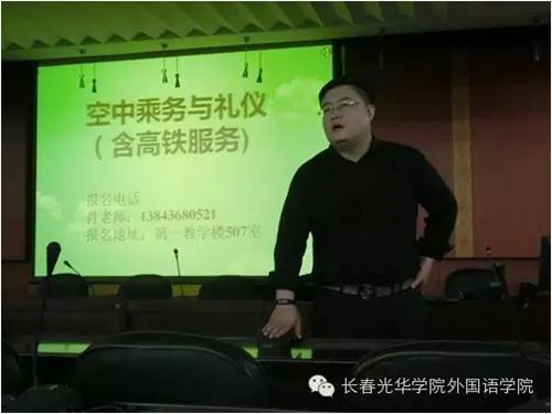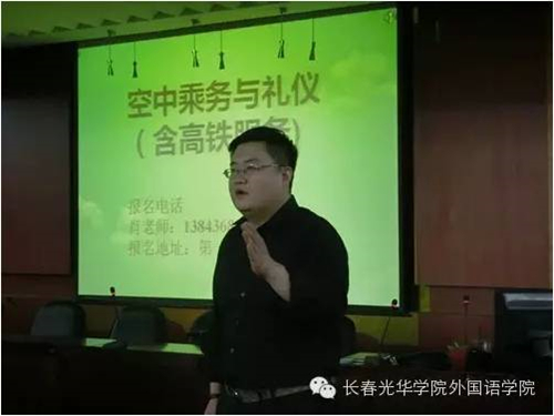 老师以PPT的形式向我们展示了空乘的职业要求和操守。在职业方面,他阐述道,空乘是不少女生所向往的,她们高端大气上档次,谈吐间透露着别样的韵味与气质;但是在专业方面,除了天生丽质外,还要有后天不断的培养。除了每周学习民航乘务员课程和一些实践培训以外,英语方面专业性人才在国内外空乘领域市场广阔,尤其是口语流利的专业性人才在国际航班上炙手可热。公司倾情打造的应用型特色专业“空乘携手外语”于今年隆重推出,为同学们拨开云雾,明确方向。