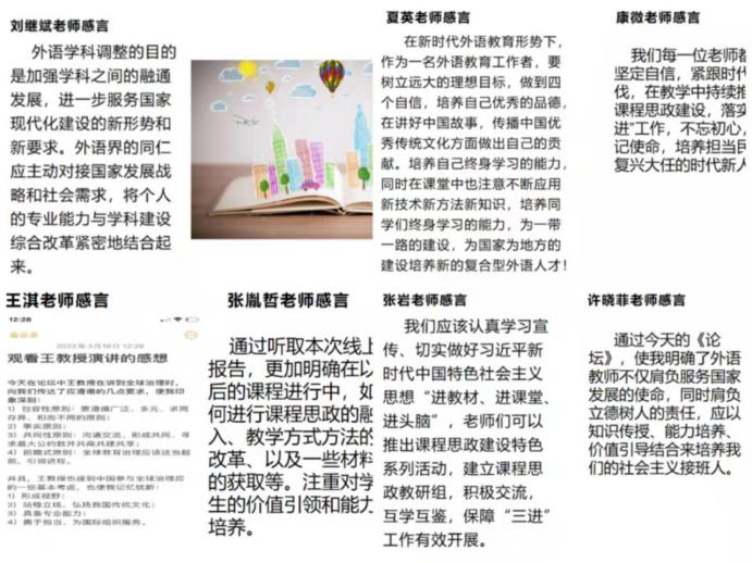 会后全体教师开展了专门交流讨论活动,每位老师抒发了自己的感想与见解。综合起来,是现在高等公司外语发展要培养具有家国情怀,全球视野,有专业本领的高素质人才,任务是推动中国更好走向世界,让世界更好了解中国。高校要积极参与全球治理,国际化和信息化的跨界融合带来的是更多的挑战与机遇。