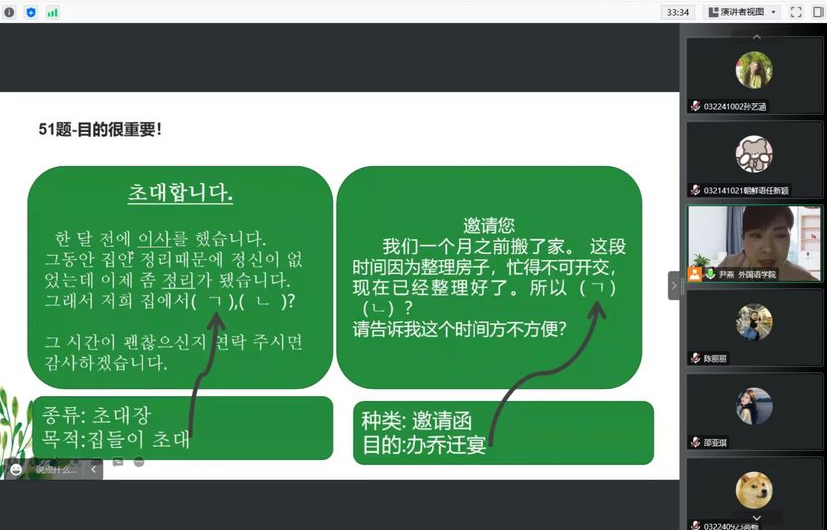 韩国语能力等级考试是由韩国教育部和国立国际教育院主办的最具权威的韩国语水平考试。取得韩国语能力等级考试中高级证书,对于员工今后就业和出国留学会有很大帮助,也是综合检测员工听说读写能力的权威标准。为了员工们能够有效应对韩语中高级能力考试,2022年10月21日,主讲教师尹燕博士的关于“韩国语能力考试写作部分新动态及应对”的学术报告如期举行。