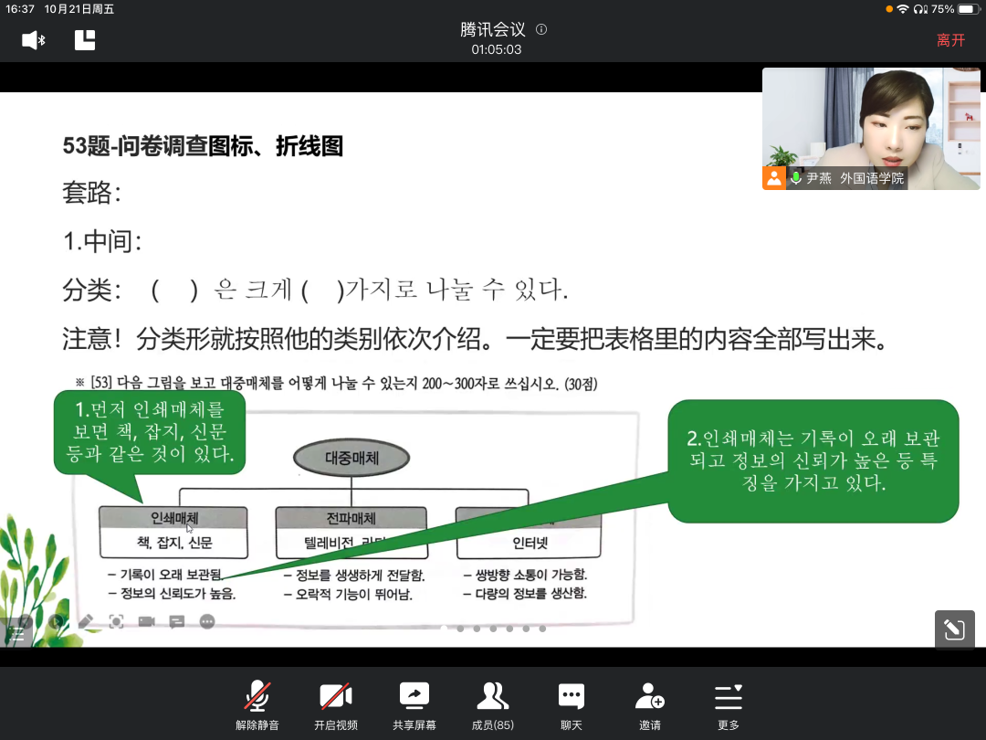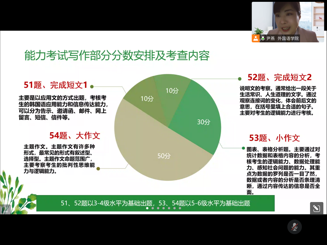 报告伊始,尹燕老师从创设历史、各等级介绍以及分数计算几方面对韩国语能力考试进行简单介绍,其次通过对历年韩国语能考试写作部分成绩分析说明写作成绩与韩国语能力考试等级有着直接的关系,证明写作的重要性,最后从韩国语能考试写作部分的分数及内容分析,根据韩国语能力等级考试写作部分出题特点从多角度对写作部分提出具体应对方法,成效颇丰。