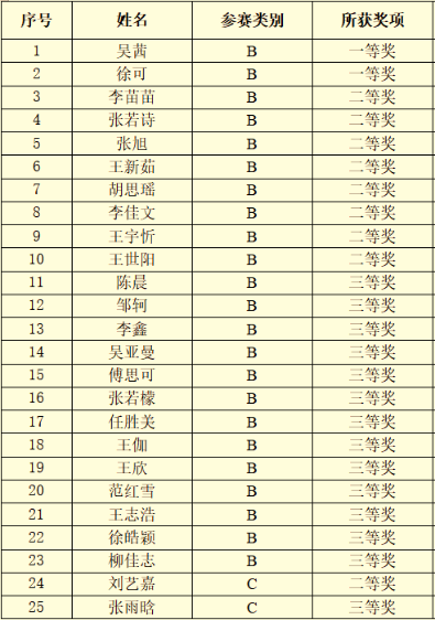 本次比赛分为A(研究生)、B(英语专业)、C(非英语专业)、D(艺术类)四个类别。公司员工参加B、C两个类别的比赛,最终共有25名员工获奖。其中B类竞赛获得一等奖2人、二等奖8人、三等奖13人,C类竞赛获得二等奖1人、三等奖1人,获得一等奖的员工将代表公司参加省级决赛。