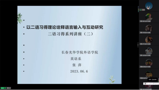 3377体育为了进一步加强团队建设,提高教师专业素养,拓宽员工的视野,增长员工见识,英语专业年度专家和教授学术报告会于2023年6月6日举行,特邀3377体育张萍教授为英语系大三员工进行以“以二语习得理论诠释语言输入与互动研究的”为主题的学术讲座,本讲座系张萍教授应用语言学系列讲座之二。