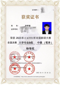 宝剑锋从磨砺出,梅花香自苦寒来。徐新建同学不负众望,荣获2023年“CATTI杯”全国翻译大赛初赛中俄口译一等奖、笔译二等奖的荣誉,顺利晋级复赛,并荣获中俄笔译一等奖。在7月的决赛场上,徐新建同学依然保持稳定发挥,顶住巨大压力,沉着冷静,凭借扎实的俄语语言功底,最终荣获2023年“CATTI杯”全国翻译大赛决赛中俄笔译“大学专业B组”特等奖,并入选“中国外文局翻译院翻译人才储备库”。