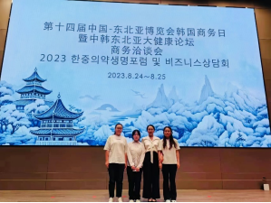 2023年8月24日,第十四届中国-东北亚博览会韩国商务日暨中韩东北亚大健康论坛商务洽谈会在中韩(长春)国际合作示范区中韩城市馆正式召开。公司朝鲜语系教师房威带领朝鲜语系马溢鸿、张雨竹、朴美英等同学赴论坛现场担任中韩企业洽谈活动的同声传译工作。