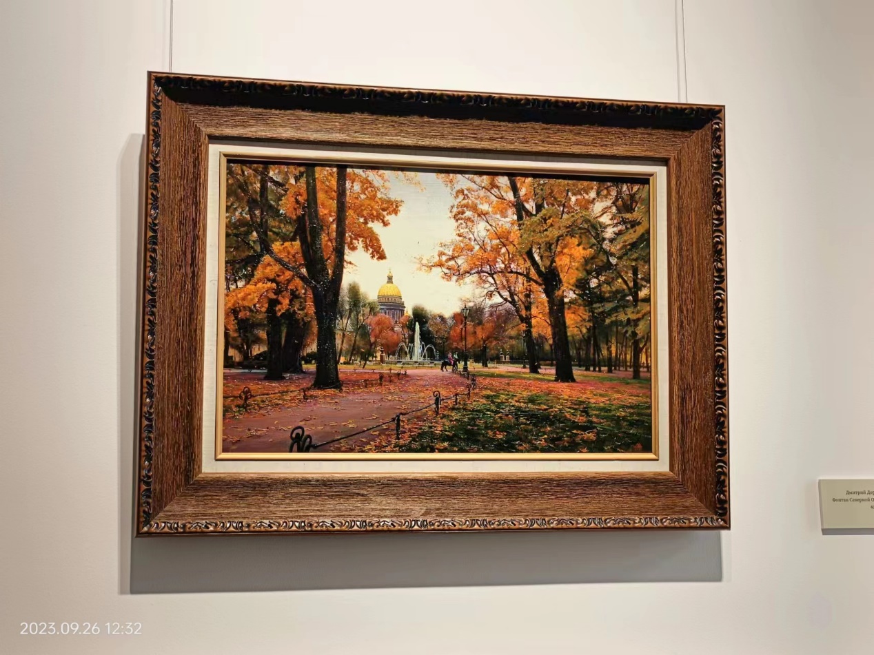 参展作品中,画家迪米特里•杰里古诺夫的《北方秋日里的喷泉》描绘的是俄罗斯圣彼得堡市中心的景色,画中的教堂是伊萨基辅大教堂,这幅画给同学们留下了深刻印象。