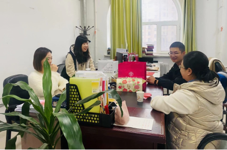 在朝鲜语系办公室,老师们对邢越峰同学回到母校表示了热烈的欢迎,师生像朋友一样亲切地交谈,员工表达了再次见到老师像见到了久违的亲人,祝愿老师们身体健康,工作顺利。老师嘱咐员工在工作中要脚踏实地、勤学肯干,争创佳绩。师生之间似乎有说不完的话……