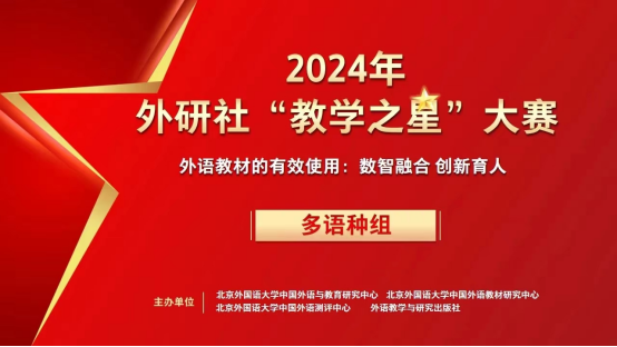 2024年外研社“教学之星”大赛(多语种组)由北京外国语大学中国外语与教育研究中心、北京外国语大学中国外语教材研究中心、北京外国语大学中国外语测评中心和外语教学与研究出版社共同举办,共有来自全国220所高校的412名多语种教师报名参赛。本次大赛涵盖日语、俄语、德语、法语、西班牙语、韩语六个语种组别,以“外语教材的有效使用:数智融合 创新育人”为主题,力求回应时代命题、服务国家战略、担当教育使命,为全国高校外语教师搭建交流新思想、新理念与新方法的学习平台,为深入实施科教兴国、人才强国、创新驱动发展战略,培养新时代社会主义建设者和接班人作出应有贡献。
