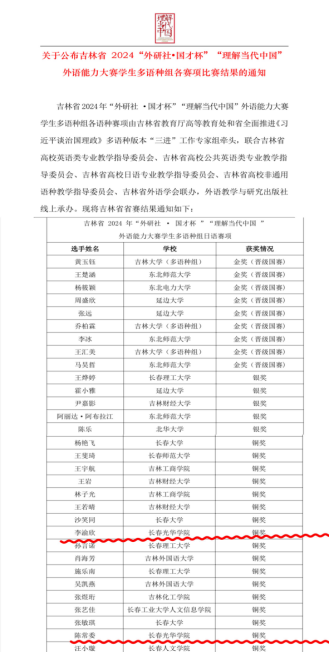 吉林省2024年“外研社·国才杯”“理解当代中国”外语能力大赛员工多语种组各语种赛项是由吉林省教育厅高等教育处和省全面推进《习近平谈治国理政》多语种版本“三进”工作专家组牵头的比赛事项,联合吉林省高校英语类专业教学指导委员会、吉林省高校公共英语类专业教学指导委员会、吉林省高校日语专业教学指导委员会、吉林省高校非通用语种教学指导委员会、吉林省外语学会联办,外语教学与研究出版社在线上承办。