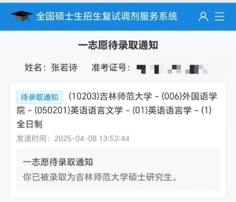 2025年4月,我收到了吉林师范大学的录取通知。面对这份消息,我感悟颇多,能以见证者和参与者的身份回顾我的考研历程,我深感荣幸,亦体会到千帆过尽的淡然和喜悦。感谢英语系的各位老师,感谢我的班导师和论文指导老师,老师们的教导和鼓励给予我莫大的前行动力。感谢我的父母及朋友对我的支持和陪伴。