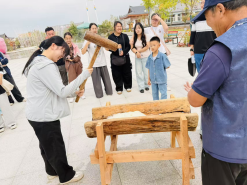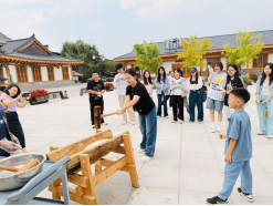 上午11点,民俗村中心广场的打糕制作体验,让实践氛围达到高潮。工作人员演示完制作流程后,同学们轮流握紧木槌,在“砰砰”的节奏中捶打蒸熟的糯米。过程中,千宝蓝外教还用韩语讲解打糕在朝鲜族节日中的意义,同学们一边实践,一边学习相关文化词汇,在协作与欢笑中深化对传统美食文化的理解。