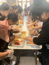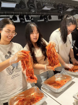 11:30,辣白菜制作体验接力开启。每位同学都领到装有白菜、辣椒面、大蒜等原料的工具盆,讲解员用韩语词汇介绍原料,同步讲解腌制技巧与发酵原理。同学们认真涂抹酱料、按压原料,不仅掌握了辣白菜的制作方法,更通过动手实践,理解了这道传统美食背后“顺应时节”的饮食智慧。