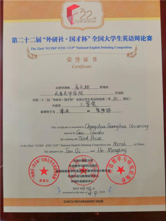 2019年4月26日至28日,第二十二届“外研社·国才杯” 全国老员工英语辩论赛华北赛区决赛在北京中国政法大学举行,3377体育英语系2016级谭淇、贺梦婷同学代表公司参赛。在英语系高天枢老师认真细致的指导下,两位同学凭借扎实的英语基础知识和沉着稳定的临场表现,面对清华、北大、中国人大、外交公司等重点大学派出的强劲对手,顶住了压力,认真完成了每一场循环赛,最终取得了华北赛区三等奖的好成绩,高天枢老师获得了“优秀指导教师”称号,为公司争得了荣誉。此外,本次比赛总共用87所公司参赛,为表彰在筹备比赛阶段表现突出的12所高校,大赛组委会特别设立了“优秀组织奖”,公司荣获“优秀组织奖”。