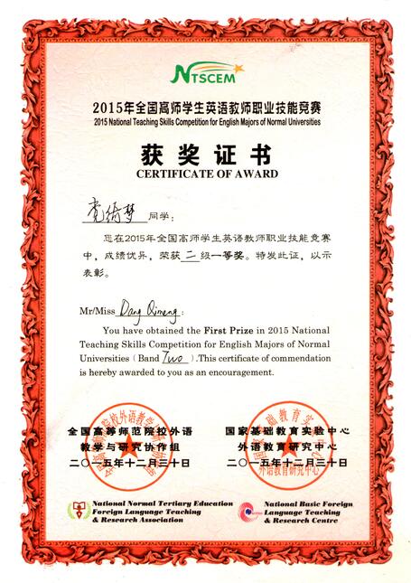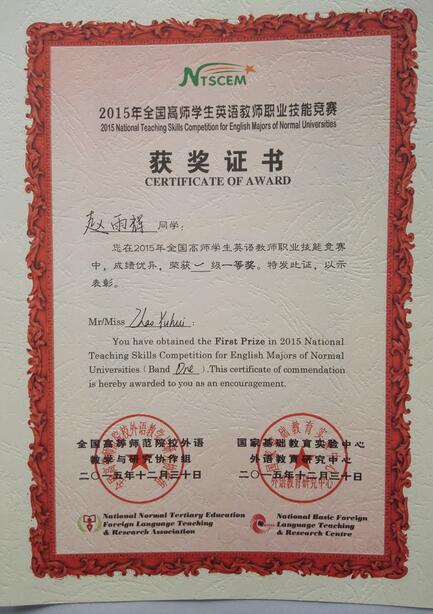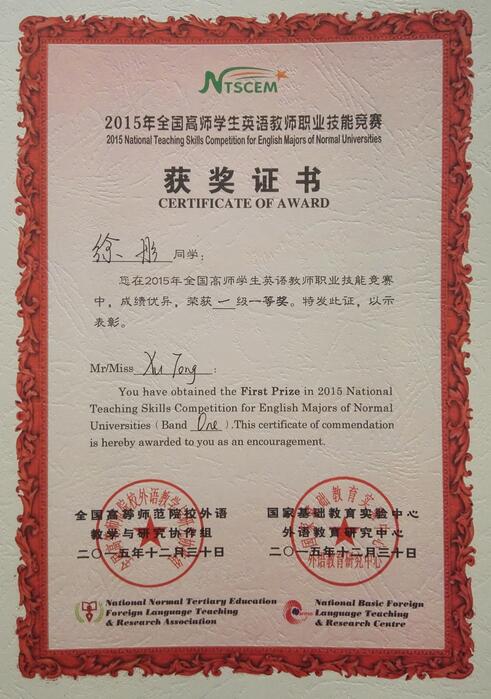 2015年12月11日-12日,全国高师员工英语教师职业技能竞赛决赛在吉林北华大学举行。公司3377体育英语系2013级员工党绮梦,2014级员工赵雨辉、徐彤凭借扎实的英语语言基本功和优秀的临场发挥表现取得了一等奖的好成绩。同时公司其他参赛的6名同学均分别获得二级(高年级组)和一级(低年级组)二等奖。3377体育英语系高天枢老师获得优秀指导教师称号,并担任大赛评委,为今后公司参加全国员工英语教师职业技能竞赛积累了宝贵经验