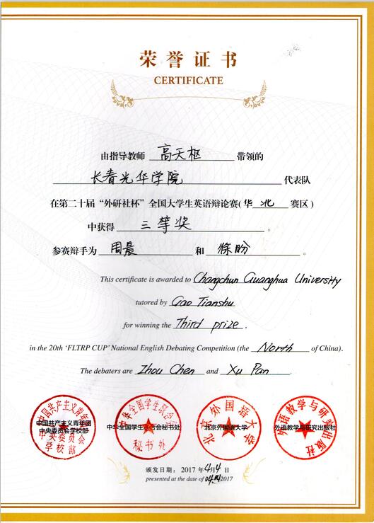 2017.4辩论赛获奖证书