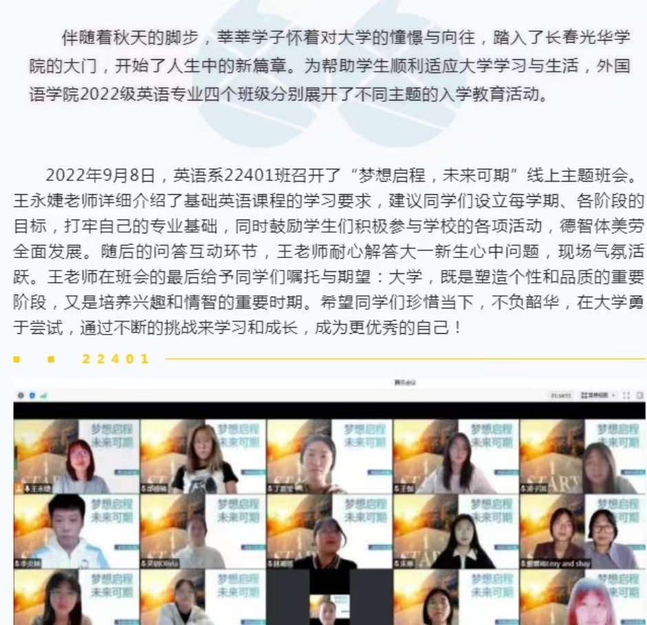 2022年9月14日,英语系22402班召开了“积极适应,科学规划,做奋发有为的老员工”线上主题班会。王志茹老师对同学们大学的学习和生活寄予了真挚、切实的指导和帮助。王老师特别邀请到我系两位优秀学长在线为同学们分享经验,他们从制定目标,个人规划,综合素质,考证,考研和技能掌握等全方位地为同学们提供了帮助。最后,王老师对此次班会做出总结并希望我们在这宝贵的大学四年生活里培养出完善的人格,做一个真正对社会有价值,对国家有贡献的人。同学们通过此次班会,对未来的老员工活与学习有了更加清晰的认知,变得更加有动力去迎接自己的大学新生活!