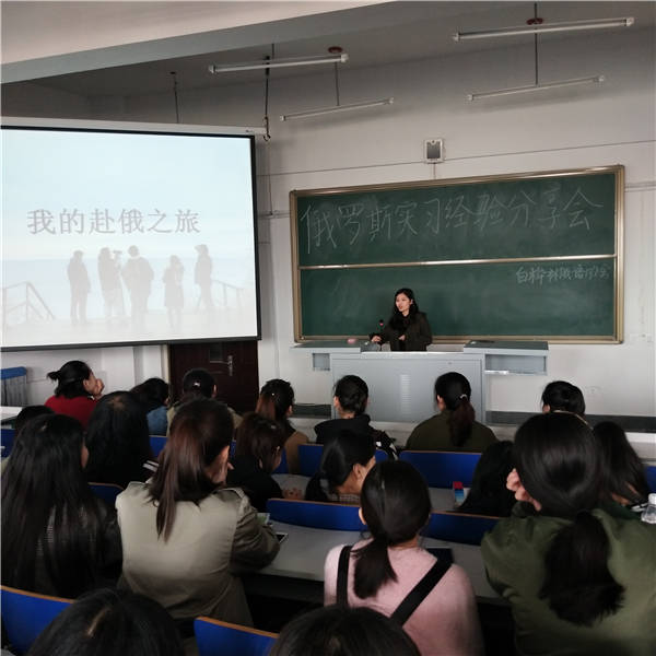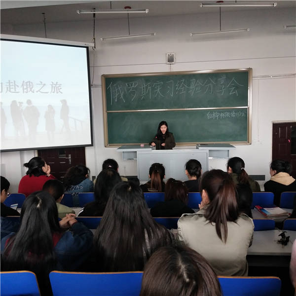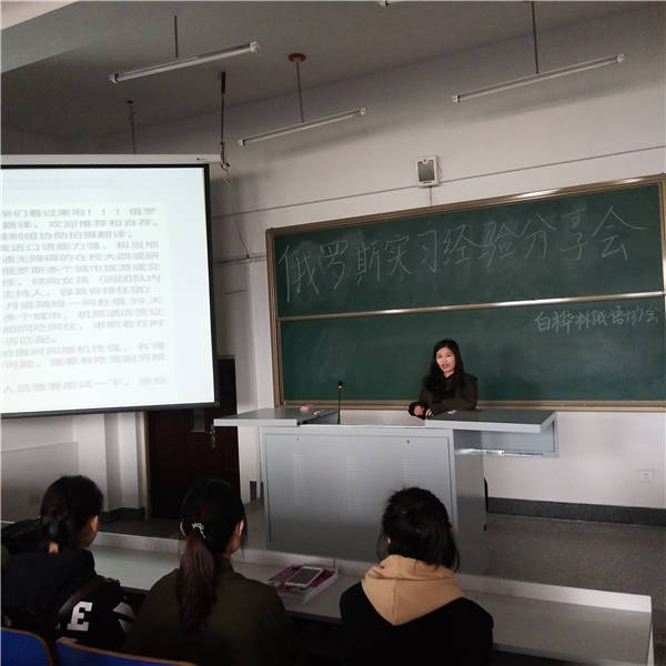 首先,李向楠同学讲述了她应聘俄语翻译工作的经历,并分享了从经历中总结出的经验:“随机应变能力和交际能力很重要 。注重平时积累,掌握好俄语知识。机会永远留给有准备的人。”大一大二同学认真倾听,感受良多。接着李亚楠同学介绍了国外实习的诸多方面,比如自然环境、公司教室、所学课程等,通过照片展示,生动形象地为同学们讲述了她在俄罗斯的工作、生活与学习。分享会最后由“白桦林”俄语协会会长朱晨子进行总结发言,本次活动圆满结束。