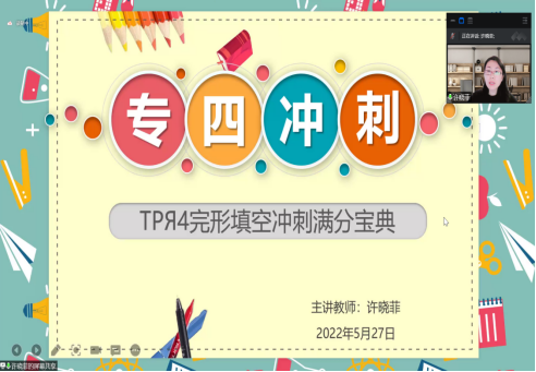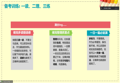 许老师通过自己多年丰富的教学经验,对历年完形填空真题进行总结分析,针对不同题型列出不同的学习方法。另外,许老师教给同学们做完形填空类型题的解题口诀“完形填空本不难,把握主旨最关键。考题在手先别忙,急于做题太慌乱,不要急于看选项,快速跳空读全文。脑中形成一幅图,紧扣中心不走偏,纵使有误也正常,不会连错一大片。若不清楚重来过,这样不算费时间,毕竟目标在高分,符合正确效率观。若未读懂全靠蒙,糊里糊涂全完蛋。首句特别要重视,信息丰富莫小看。再看选项寻搭配,语义辨析看情景。注意连接信号词,上文下文联系紧。填完通读来一遍,语感语境来检验”,帮助同学们更加轻松简单地面对相关类型题。