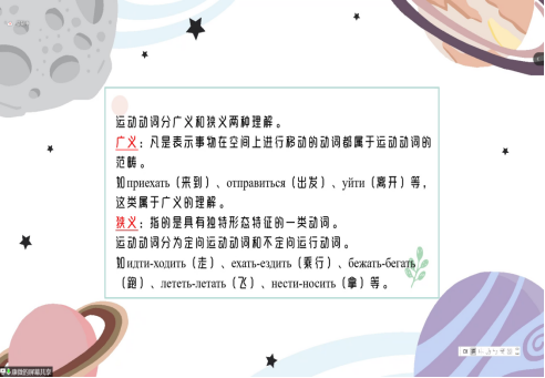 俄语的运动动词是一个独特的存在,狭义的运动动词各自成对,且都属于未完成体。也就是,运动动词没有对应的动词体,只有成对的运动动词。运动动词分广义和狭义两种理解。凡是表示事物在空间上进行移动的动词都属于运动动词的范畴。如приехать(来到)、отправиться(出发)、уйти(离开)等,这类属于广义的理解。