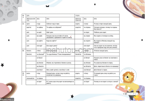 值得注意的是:运动动词都是成对的,而运动动词加了前缀,表达的就不再是运动动词的概念,而是动词体的概念。也就是: