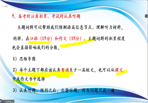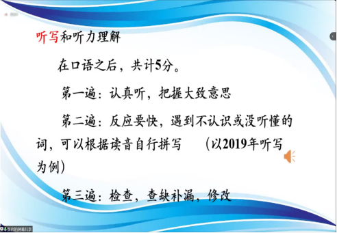 听力理解是四级考试的第三个环节,在口语和听写之后,共计15分,占总成绩的15%。听力考试包括1个长对话和3篇短文,每篇材料均连续播放2遍。每个问题后留有8-15秒停顿,供大家选择答案。全部录音放完之后,我们有2分钟的时间来涂答题卡。随后,张岩老师根据专四听力历年真题进行详细讲解,通过对细节推理题、文章主旨题、综合判断题等不同类型进行分析讲解。