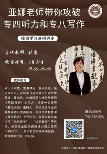 张岩老师通过对历年俄语专四考试听力和专八作文题型的分析进行讲解,从相关题型考点到相关题型的答题技巧带领同学们遨游俄语学习海洋。
