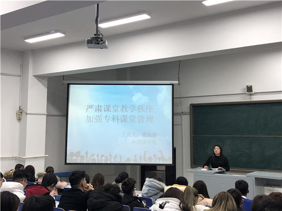 为进一步严肃员工课堂学习纪律,维护良好的课堂教学秩序,提高课堂教学效果,加强员工学风建设。公司于2018年11月25日晚上五点半在一教阶梯十,组织全体2018级专科员工召开“严肃课堂教学秩序,加强专科员工课堂管理”主题班会教育活动。班会由党总支副书记兼2018级辅导员戚旭娣主讲。