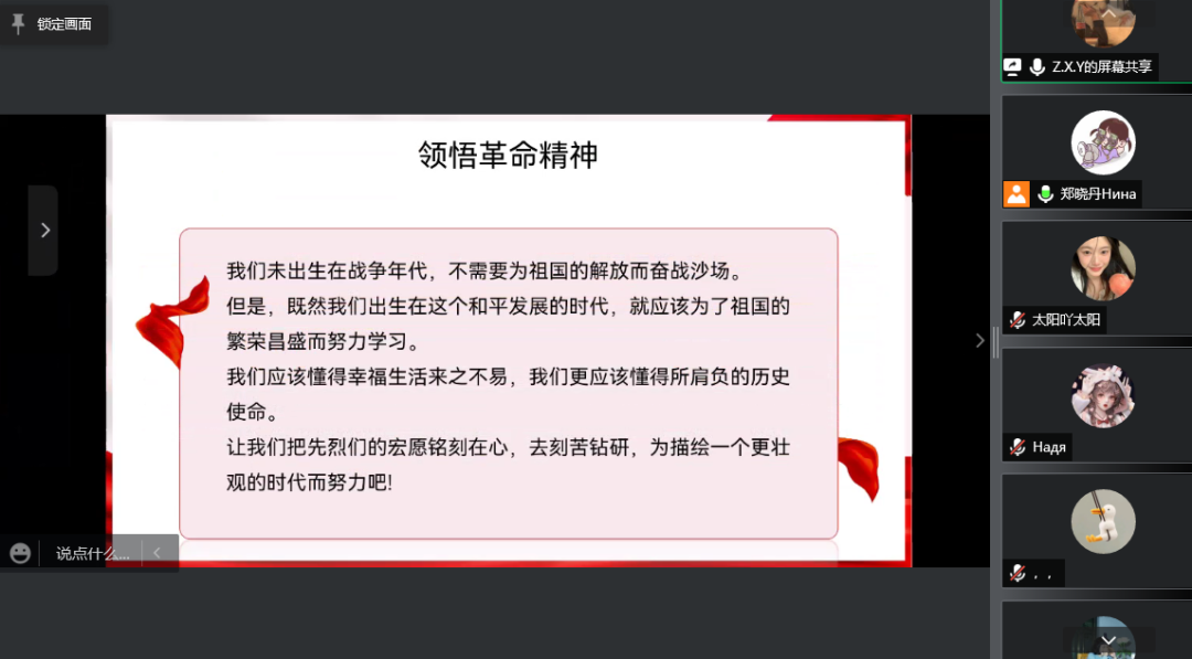 活动伊始,主持人通过PPT带领同学们了解建党一百周年来党的发展历程,感悟百年征程的伟大与艰辛,并通过讲述中国共产党成立100年以来取得的伟大成就,引导同学们深入学习和了解党的光辉历程,感悟党的初心和使命。