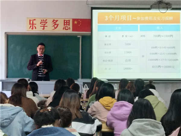 为帮助公司日语系2018级员工更好地参加2020年老员工赴日短期实践,2019年10月29日下午1:00分,中国人民对外友好协会对外友好服务中心负责人在第一教学楼421教室为公司日语系2018级员工举办了赴日社会实践活动宣讲会。