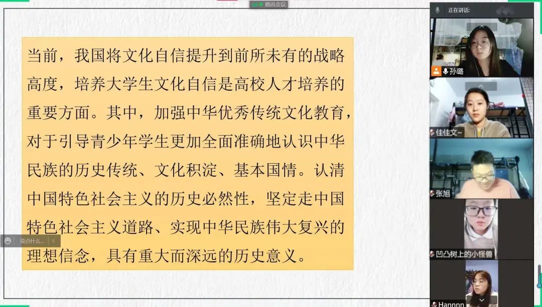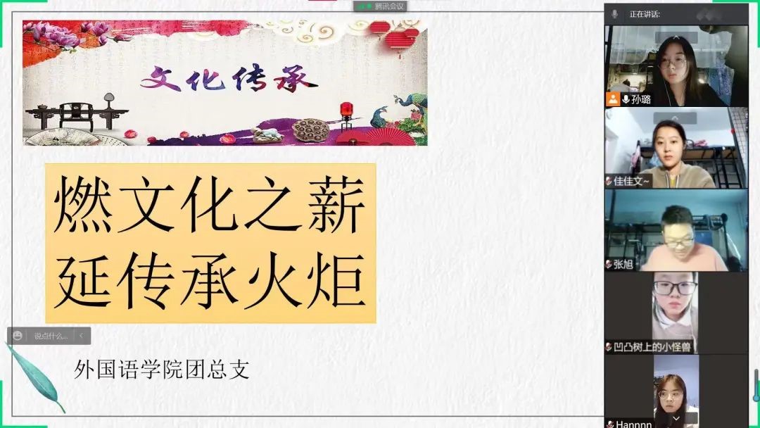 活动伊始,主持人向同学们详细介绍文化自信是一个民族,一个国家对自身文化价值的充分肯定;接着,主持人鼓励同学们作为新时代青年要全面认识中国的传统文化,主动学习并继承优秀文化,应当将自身知识与文化传承结合起来,推陈出新,让传统文化与当代社会交融交汇。